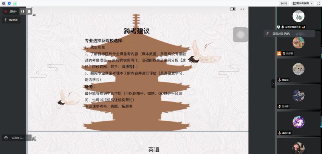 吴娱,2018级汉语言文学专业学生,考研至兰州大学汉语国际教育专业。作为跨专业考研学生,她向同学们分享了一些跨专业考研的经验以及背诵的技巧。她建议同学们在背诵专业课时要多总结、多思考、多积累。在确定目标院校后,要尽早开始准备,打有准备之仗。