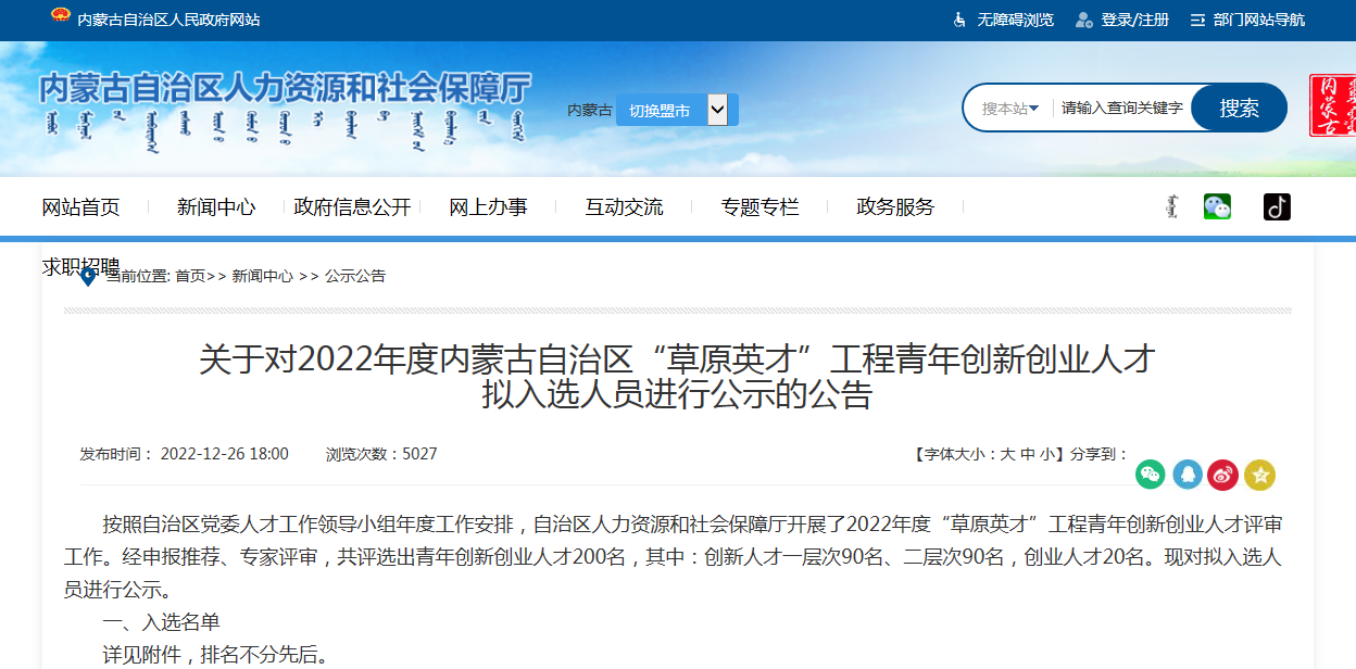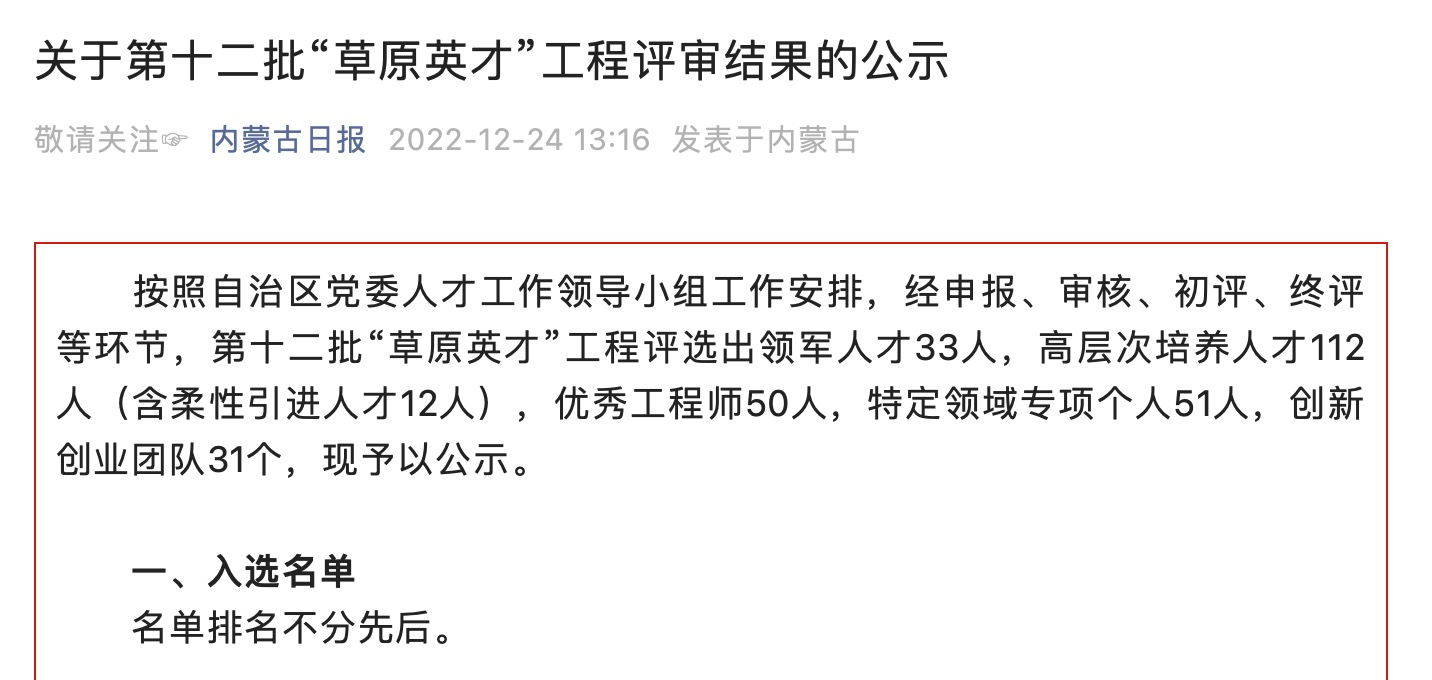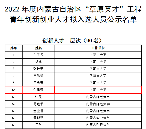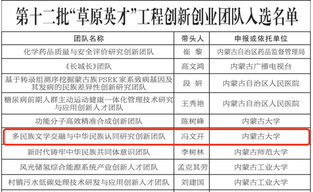 近日,内蒙古自治区党委人才工作领导小组办公室公示了第十二批“草原英才”工程入选名单,我院教师冯文开领导的多民族文学交融与中华民族认同研究创新团队入选创新创业团队;内蒙古自治区人力资源和社会保障厅公示了2022年度内蒙古自治区“草原英才”工程青年创新创业人才拟入选人员名单,我院教师付建荣入选创新人才一层次。入选“草原英才”工程是对我院教师学术创新能力的肯定与激励,同时也极大激发了我院全体师生的学术创新热情。