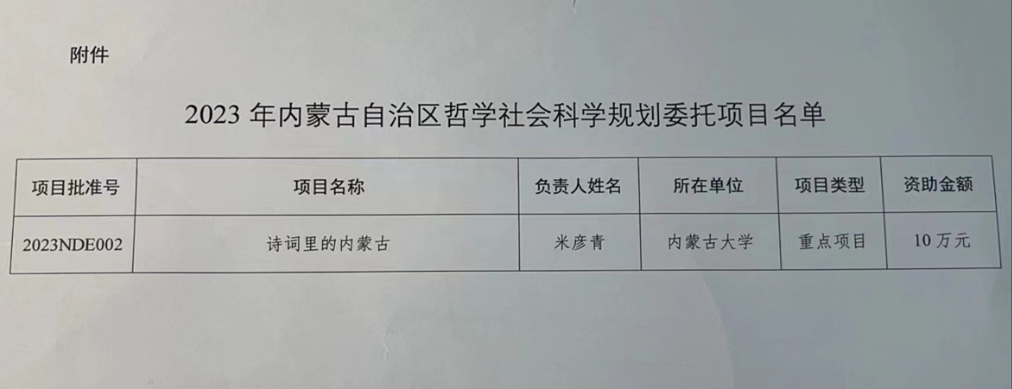 近日,内蒙古自治区哲学社会科学规划办公室公布了2023年内蒙古自治区哲学社会科学规划委托项目名单,我院米彦青教授申报的《诗词里的内蒙古》获准重点项目立项,资助经费10万元,这是我院教师在学术研究方面的重要成果,体现了我院在科研方面的进步。