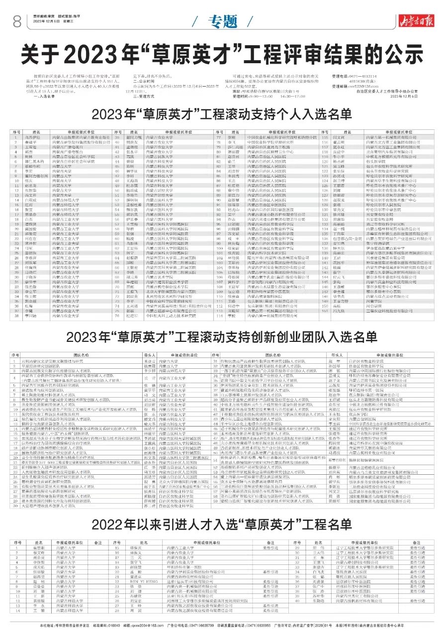 2023年12月6日,自治区党委人才工作领导小组办公室发布《关于 2023年“草原英才”工程评审结果的公示》,我院院长米彦青教授领衔的“元明清蒙汉文学交歌文献整理与研究”创新创业团队入选2023年“草原英才”工程滚动支持创新创业团队入选名单,冯文开教授入选2023年“草原英才”工程滚动支持个人入选名单。