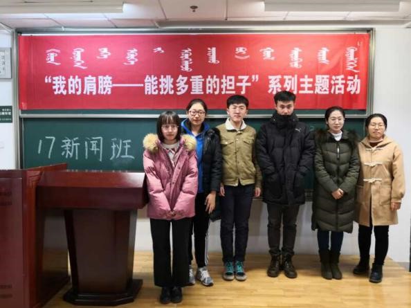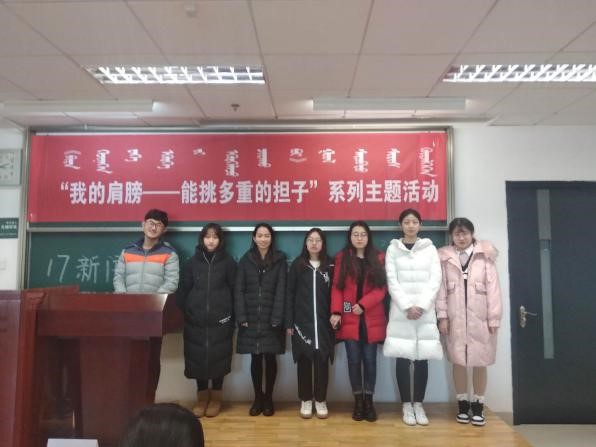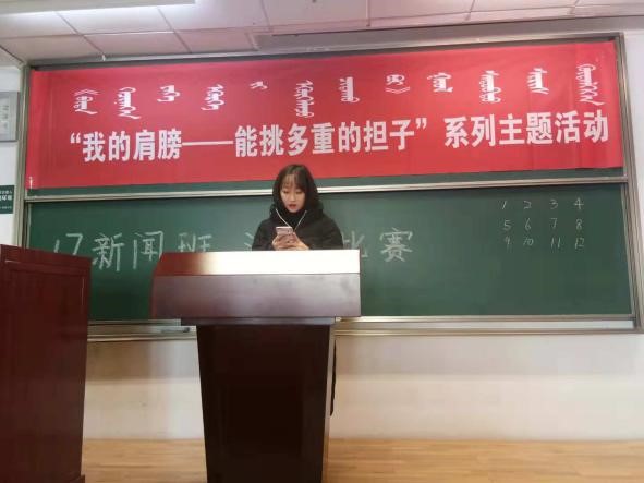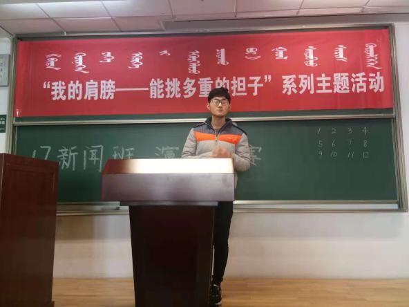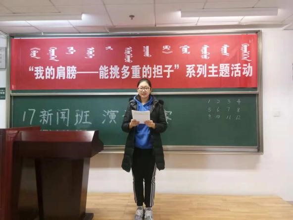 12月12日下午14点30分,我院2017级新闻学专业的同学在主楼0715教室举办了“我的肩膀——能挑多重的担子”系列主题团日活动。本次活动以演讲比赛的形式举办,主题是习近平主席的《青年大学习》。