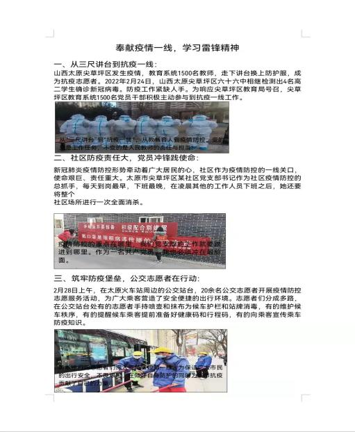 用雷锋精神描绘“志愿红”,我院学生组织成员一直在路上。职业发展部陈闻笛同学与舍友们随9728太阳集团微尘志愿者协会到达晓霞特教康复中心开展志愿活动,为残障的小天使们送去关爱,感悟生命的另一种真谛;综合协调部李昊宇同学善于发现生活中的无名战士,默默用文字记录了太原火车站边20多名志愿者开展志愿活动的奉献举动;学习实践部阿苏茹同学心怀崇敬之心,认真整理了当代雷锋的感人事例......