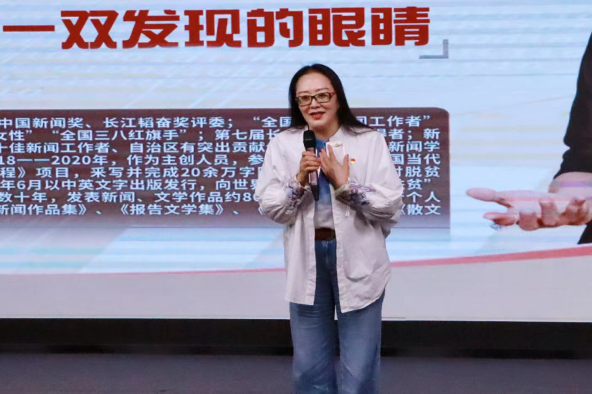 第七届范长江新闻奖获得者、新疆日报社原首席记者、高级记者刘枫也讲述了自己从事新闻工作的一些难忘经历,鼓励同学们树立坚定的理想信念、学习贯彻长江精神。