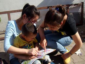 聋哑特殊教育学校的孩子们对于大家的到来显得特别激动,大家刚进校门就被小朋友们热情地围着。他们虽然不会用语言表达自己的感情,但是从他们的天真无邪的眼神和笑容中可以看出他们对大哥哥大姐姐的喜爱。同学们和小朋友们围坐在一起玩了丢手绢的游戏,又为他们表演了各种儿歌,校园里欢声笑语,掌声不断,将欢乐的气氛推向高潮。