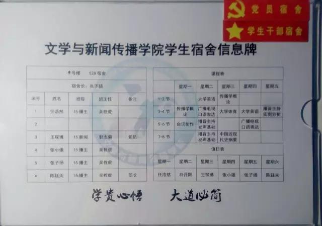 我院的学生宿舍信息牌按照学校要求,在标明了楼号、宿舍号、班级名称、宿舍成员、宿舍值日表、课程表的基础上,增添了学院院徽及院训,同时对党员宿舍和学生干部宿舍分别单独标记,希望党员和学生干部们以身作则,典型示范,起到模范带头作用。