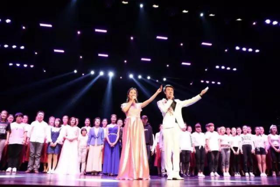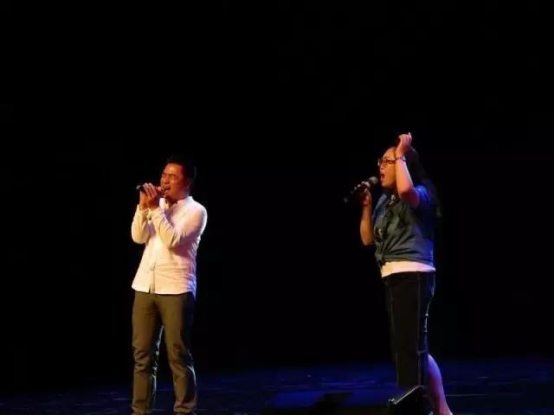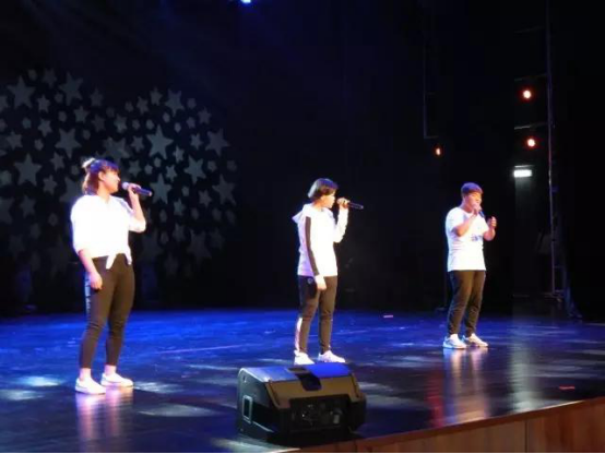 我院多才多艺的老师们同样给大家带来沉稳大气的表演。文学博士远心老师与我院学生杨翔宇、孙旭凯、侯佐儒共同朗诵了远心老师的作品《大黑河》。这首一百五十行左右的长诗体现了诗人自我探寻、自我生长、灵魂重生、创造的精神历程。抑扬顿挫的朗诵,给在座的每个人以震撼。 研究生辅导员鄢冬老师和2013级播音与主持艺术专业的班主任刘国慧老师合唱的《我是一只小小鸟》,以高亢嘹亮的声音开启了晚会的第二个高潮。他们动感的嗓音震彻心扉,像逐梦路上的一只小小鸟引吭高歌、直冲云霄。而学历高、颜值高、身材好的16级播音主持专业班主任马瑜泽老师,为大家带来了正能量爆棚的歌曲《给未来的自己》,大气磅礴的曲风给我们逐梦的勇气。