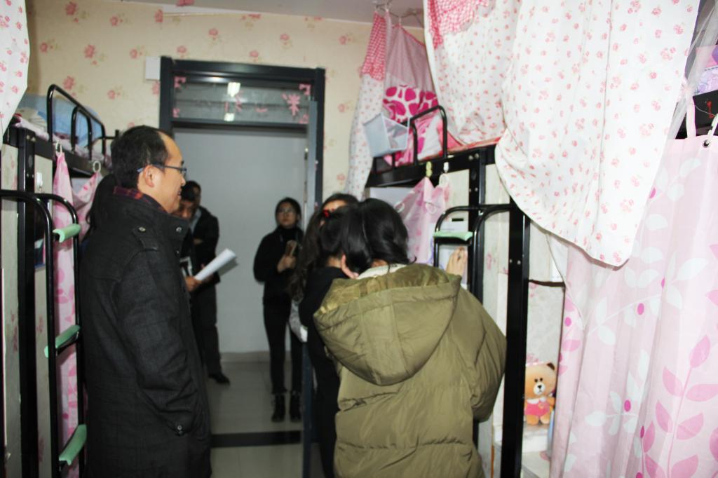 夜查过程中,老师们和学生会成员走进每一个宿舍,根据国庆前的摸底情况表,逐一与同学们核实住宿情况以及实习单位的情况。同时,老师也提醒同学们,最近气温骤降,宿舍还没有供暖,特别叮嘱同学要防寒保暖、预防感冒。