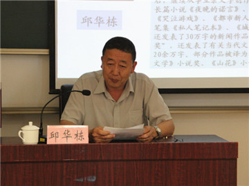 在讲座中,邱华栋副主编仔细分析了人民文学杂志中的各类文本,阐述了对于新生派作家与成名作家间用稿的取舍问题,他认为,在当今社会,推举实力派的新生作家对于文学乃至中国当代文坛十分必要,。为文坛注入新的活力和血液,使作家能够上承传统,下继创新,使读者能够从中看到与社会、与生活紧密相关的文学作品而是当今所有编辑的一种责任与担当。他列举了人民文学杂志发表的若干文本与作家,例如著名作家王安忆、刘心武、王蒙,以及实力作家严歌苓、陈其林、刘醒龙等等。邱华栋先生对于文本的赏析与解读有着独到的见解和观念。例如他这样评价当代著名作家严歌苓的《小姨多鹤》:“她的视角与思维及其广阔,她笔下的女子超越了种族、超越了国别、超越了一切政治意识,只剩下人性的本真与纯善。在这场残酷冷漠的世界大战中,人性被磨灭、被扭曲、被遗落在人间的角落里。而她用她的笔,挖掘到了真正的光芒所在。这样的作品,怎能不获奖,怎能不感人。”邱华栋先生眼界开阔、思维活跃、观念开放,他强调,作为一名当代作家,要多读新书,读好书,只有这样才能跟上时代的步伐,才能够不断超越自己,只有超越自己,才有可能与巨人比肩。
