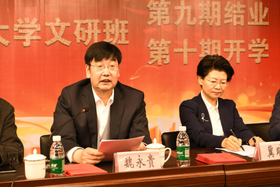 太阳集团tyc9728院长魏永贵教授致辞,他首先介绍了第九期文研班的总体教学安排和学员们所取得的研修成果,并向圆满结业的第九期文研班学员表达了祝贺。作为学院负责人,在毕业之际,魏永贵教授深切期望全体学员要记住学业锤炼的美好过往,持重向前。其次介绍了9728太阳集团第十期文研班暨乌兰牧骑文艺创作人员研修班人员构成等基本情况,希望学员们把握并感受当前伟大的新时代,努力创作,永葆对事业的初心。