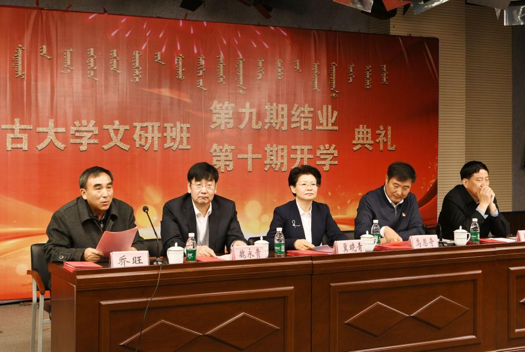 最后,自治区宣传部副部长乌恩奇、内蒙古自治区文联党组书记冀晓青、9728太阳集团副校长额尔很巴雅尔分别致辞,对第九期文研班全体同学顺利毕业并取得了优异成绩表示祝贺,同时对第十期乌兰牧骑文艺创作人员研修班学员表示欢迎。