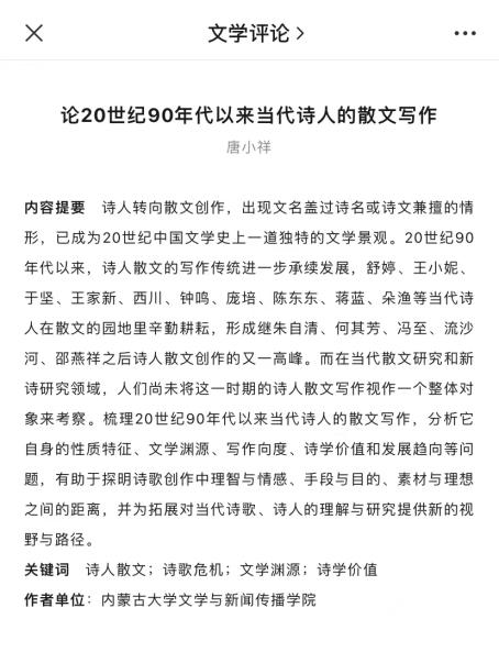 该论文系统梳理讨论了20世纪90年代以来当代诗人的散文随笔写作,认为诗人转向散文创作,出现文名盖过诗名或诗文兼擅的情形,是20世纪中国文学史上一道独特的文学景观。20世纪90年代以来,诗人散文的写作传统进一步光大,舒婷、王小妮、于坚、王家新、西川、钟鸣、庞培、陈东东、蒋蓝、朵渔等一大批当代诗人在散文的园地里辛勤耕耘,形成继朱自清、何其芳、冯至、流沙河、邵燕祥之后诗人散文创作的又一高峰。而在当代散文研究和新诗研究领域,人们尚未将这一时期的诗人散文写作视作一个整体对象来考察。梳理20世纪90年代以来当代诗人的散文写作,分析它自身的性质特征、文学渊源、写作向度、诗学价值和发展趋向等问题,有助于探明诗歌创作中理智与情感、手段与目的、素材与理想之间的距离,为修正、拓展对当代诗歌、诗人的理解和研究提供新的视野和路径。