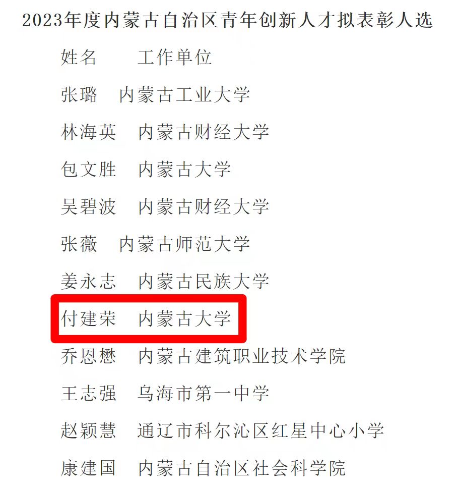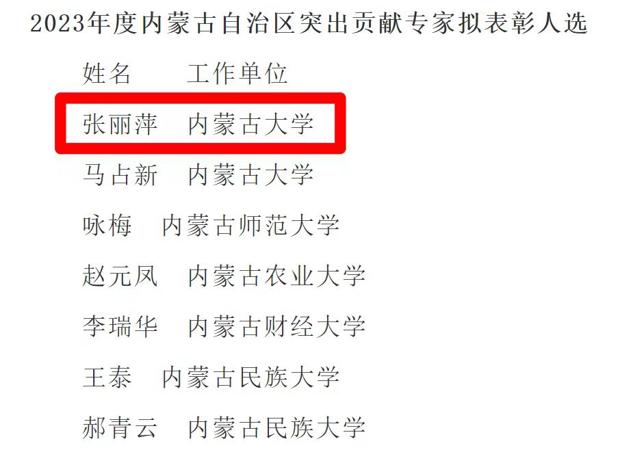 12月22日,内蒙古自治区人力资源和社会保障厅对2023年度“内蒙古自治区杰出人才”、“内蒙古自治区突出贡献专家”、“内蒙古自治区青年创新人才”拟表彰奖励人选进行公示。我院张丽萍教授入选“内蒙古自治区突出贡献专家”,付建荣教授入选“内蒙古自治区青年创新人才”。