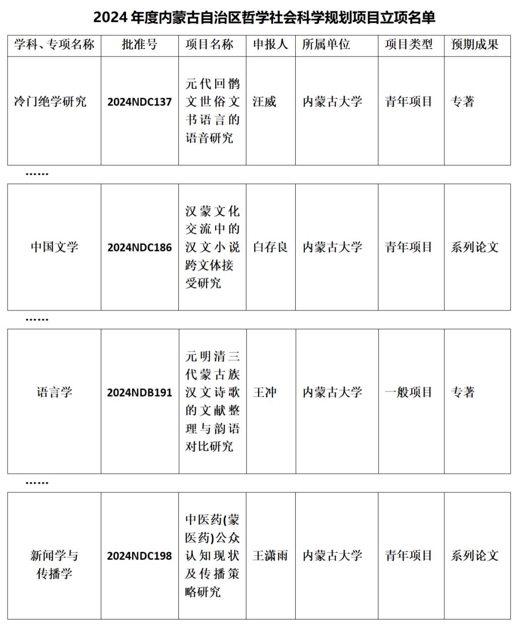 10月31日,内蒙古自治区哲学社会科学规划办公室对2024年度内蒙古自治区哲学社会科学规划项目拟立项项目名单进行了公示,我院王冲老师获批一般项目,汪薇、王潇雨、白存良老师获批青年项目。