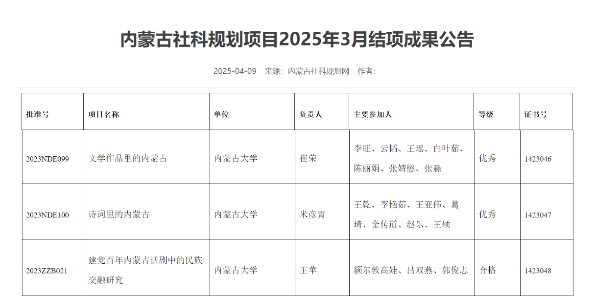 其中,我院米彦青负责项目“诗词里的内蒙古”与崔荣负责项目“文学作品里的内蒙古”获评“优秀”,我院教师王苹“建党百年内蒙古话剧中的民族交融研究”获评“合格”,三项人文学科研究因成果突出,展现了学院在文化领域的深耕与创新。
