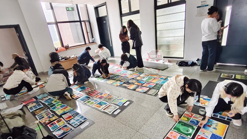 展览开始前,学生们怀着饱满的热情与专注,小心翼翼地将自己精心创作的绘画作品粘贴于展览板上,每一个动作都透露着对作品的珍视。这些作品形式多样、色彩斑斓,涵盖了多种多样的风格,是他们八周课程学习成果的精彩呈现。