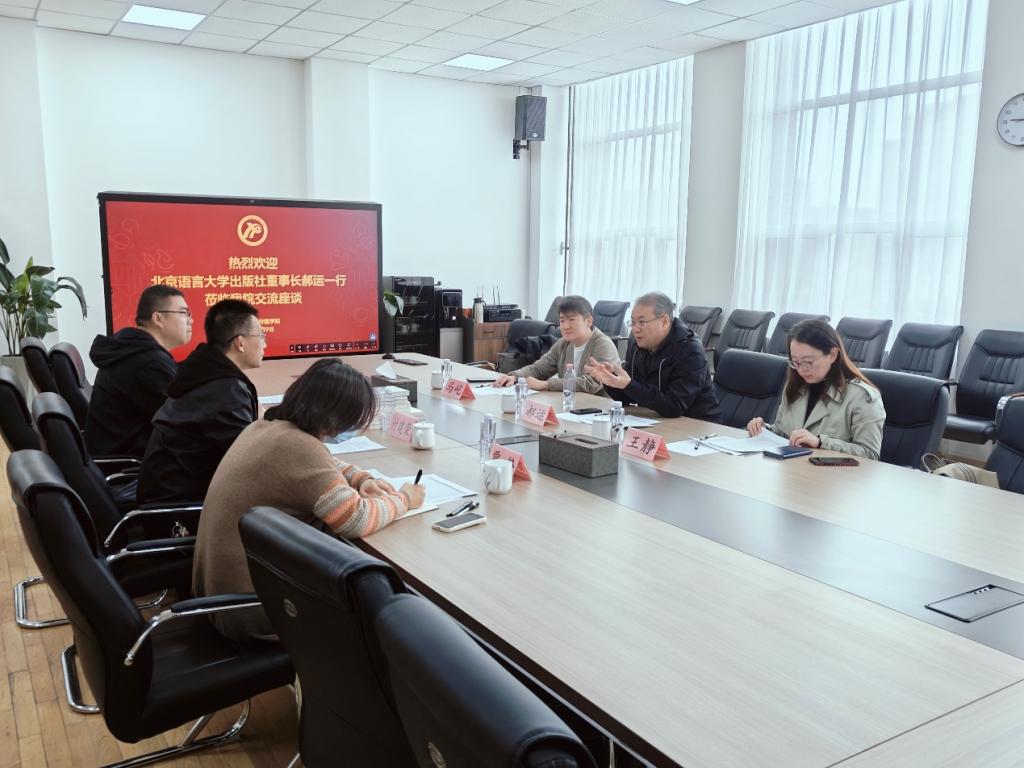 2026年4月9日,北京语言大学出版社董事长郝运、发行公司经理马屹、语文教育事业编辑部主任王静一行莅临我院调研考察和座谈交流。我院副院长付建荣、汉语言文学系主任左少峰、教务办公室主任贾静参加座谈交流。