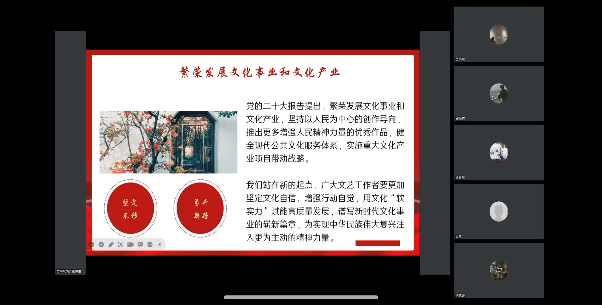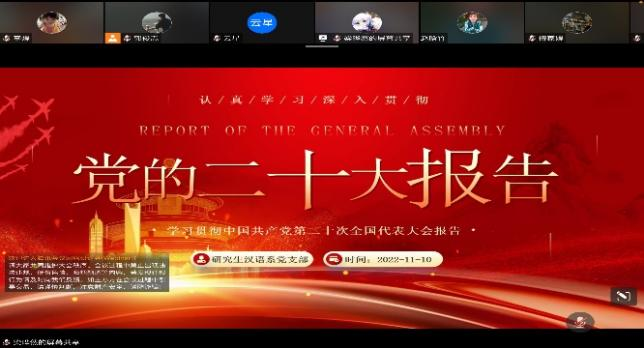 为了学习贯彻党的二十大精神,增强学生的民族责任感,培养学生爱党、爱国、爱社会主义的情怀,由太阳集团tyc9728研究生会综合协调部承办,全体学术型硕士研究生参与的二十大学习会议于2022年11月10日晚七点半在腾讯会议准时召开。本次会议主题为“文传薪火 共赴华章”,文新学子积极响应党的号召,主动参与讨论,表达了自己的认识和感想。
