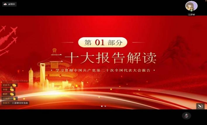 除此之外,还有七位同学分享了自己对二十大报告的认识和理解。江邵敏同学对报告中坚持问题导向的重要性发表了自己的看法。她认为,作为一名研究生,我们在学习生活中要有一双发现问题的眼睛,以问题为导向进行研究,发展创新,为祖国未来的建设添砖加瓦。赫都兰、崔竞丹向同学们介绍了“中国式现代化”的内容和本质要求。江玉婷、英格尔、孟言和高锦馨同学分别解读了报告中的“高质量发展”“文化自信”“全过程人民民主”“绿色发展”四个方面的内容。