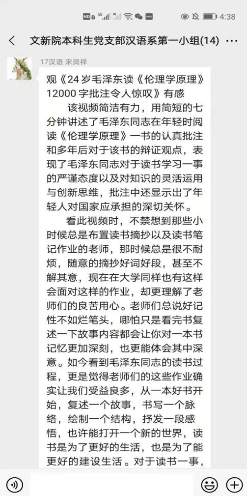 为纪念中国共产党建党100周年,引导党员们追忆初心,重温历史,“学史明理、学史增信、学史崇德、学史力行”,绘就精神底色,坚定理想信念,汲取前行力量,我院本科生党支部积极创新党史学习形式,于5月24日开展了“夜校小黑板”第一次线上集中学习党史学习教育活动,组织支部成员观看了《红色档案·24岁毛泽东读<伦理学原理>12000余字批注令人惊叹》的视频,视频观看结束后党员们积极交流观看心得。