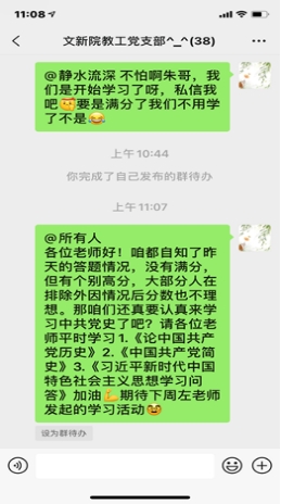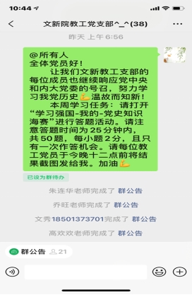 2021年4月1日,文新教工支部开展了“努力学党史,争做排头兵”学党史知识海选答题比赛活动。支部38位老师积极响应,大家纷纷打开学习强国APP里“我的——党史知识海赛”部分,在25分钟内完成50道党史知识题目,结果为及格率70%,33.3%的老师分数达到优秀率。这说明老师们的相关知识储备存在不平衡特点,有的老师经过前一阶段视频学习后,对我党历史知识常识有了较为深刻的记忆,而有的老师由于没充分准备或忘记答题时间而漏答导致分数不理想。其实,本次活动的目的就是提醒每位教工党员注意日常中的党史学习。为此,我们给老师们提供了参考资料,一起学习《论中国共产党历史》《中国共产党简史》《习近平新时代中国特色社会主义思想学习问答》等重要读物。教工支部开展每位党员轮流组织学习党史活动,既发挥了大家的主观能动性,又能集思广益每周都能有新积累。