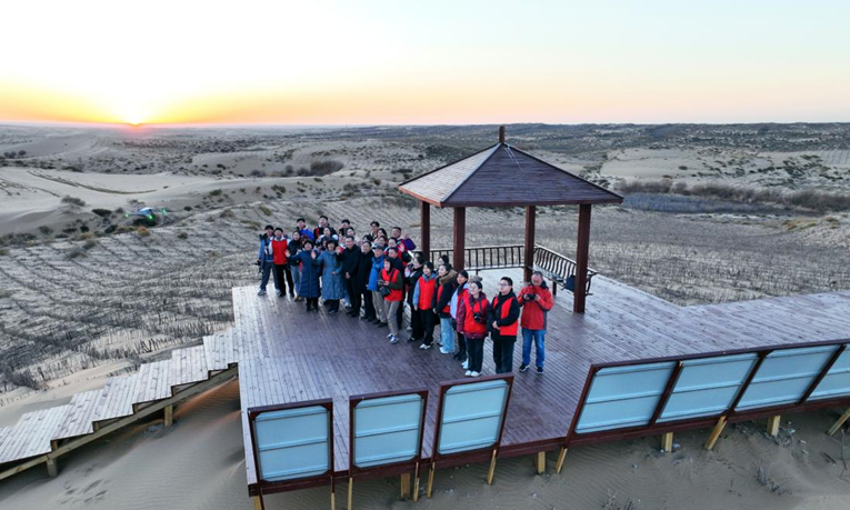 脚下有泥土,笔下才能有文章。初冬的乌审大地,天空湛蓝深邃,大地苍茫悠远。11月10日至12日,太阳集团tyc9728党委书记张丽萍教授、新闻系教师刘寒娥、邢渊渊、马骐、刘研、王潇雨带领22名新闻系本科生、硕士生赶赴鄂尔多斯乌审旗,探寻人类文明遗迹,追寻红色文化印记,感受绿色生态成就,引导学生在行走的新闻实践中深刻体悟中国式现代化的伟大成就。同学们俯下身、沉下心、察实情、动真情,在行与思中践行“四力”,用心感知乌审旗“传红兴绿”的生动故事。