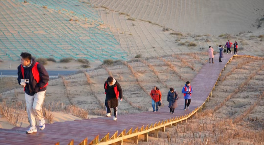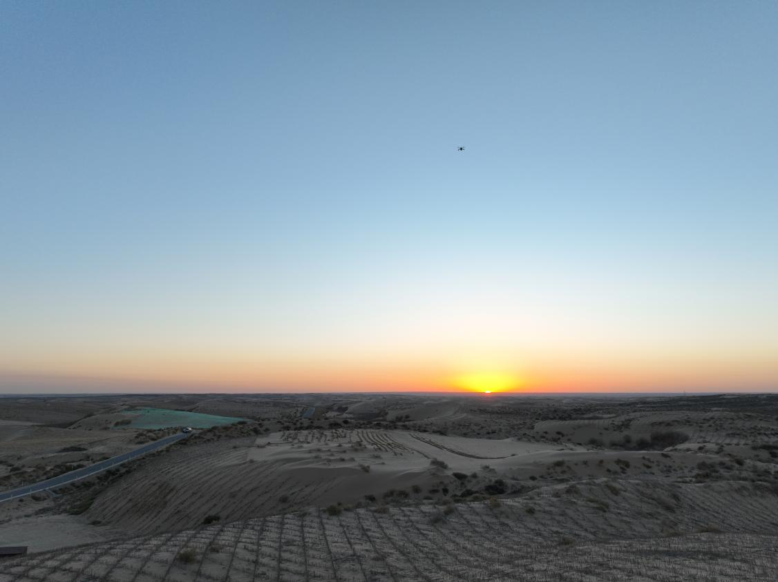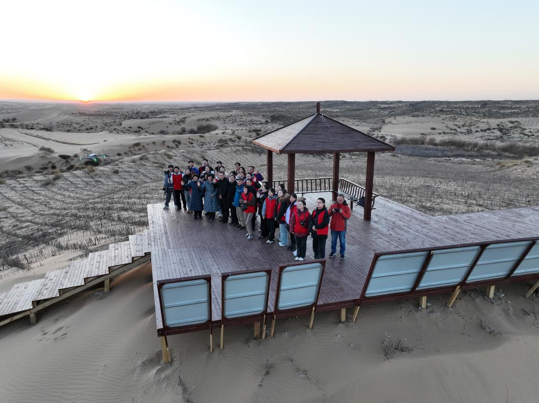 夕阳西下,余霞成绮,大漠如波,汽车穿行在毛乌素沙地腹部的蜿蜒公路上。转弯处,一轮火红落日镶嵌在茫茫大漠的地平线,把整个沙地染上一层金色。初冬的毛乌素沙地,无数道沙砾涌起的褶皱如凝固的波涛,一直延伸到天际。行进在这片沙地上的9728太阳集团新闻系师生被一番景象震撼:方格沙障如恢恢大网,将流动的沙丘牢牢固定。大家不仅惊叹于日落大漠、沙障遍野的奇观,还有这背后乌审人世世代代在沙窝窝里提着铁锹、扛着锄头、流着血汗的七十余年奋斗史。