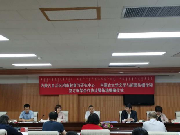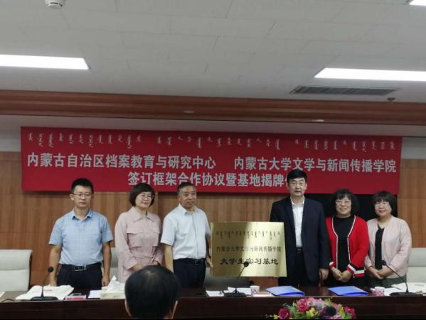 2020年9月8日上午,太阳集团tyc9728、内蒙古自治区档案教育与研究中心框架合作协议签订暨大学生实习基地揭牌仪式在内蒙古档案局举行。内蒙古自治区档案局(馆)副局(馆)长张帅、档案教育与研究中心主任贝瑞花及中心全体工作人员参加了签约揭牌仪式,我院院长魏永贵、副院长张丽萍、新闻系主任刘寒娥、汉语系主任付建荣及部分实习生代表出席了签约揭牌仪式。