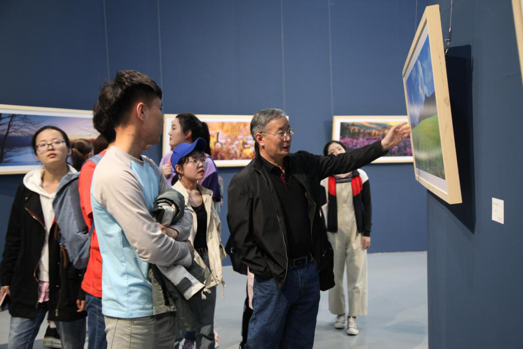 授课开始,万生云老师带领同学们来到了美术馆四楼,参观达斡尔族摄影家郭伟忠先生题为“亮丽内蒙古,净土呼伦贝尔”的师生摄影作品展。在授课过程中,万生云老师多次提到构图和光线对作品的重要性:“摄影作品同类图形相同的排列或者不同图形错落排列,均要保证画面整体性的完整统一,不能破坏画面的均衡。摄影画面中形象大小,比例适中,满足视觉悦目的需求,保持形象之间的协调,于变化中求单纯,于变化中求愉悦,于秀美中求和缓。” 同学们从中收获颇丰。